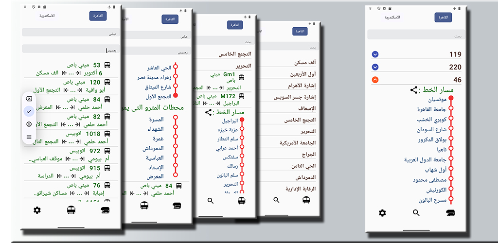 يتيح لك تطبيق “مواصلاتك يا مصر” استكشاف جميع وسائل النقل العام بسهولة، بما في ذلك الحافلات (الأتوبيسات)، المترو، والترام، مع تفاصيل شاملة عن الأرقام والمسارات لكل وسيلة نقل في مصر.