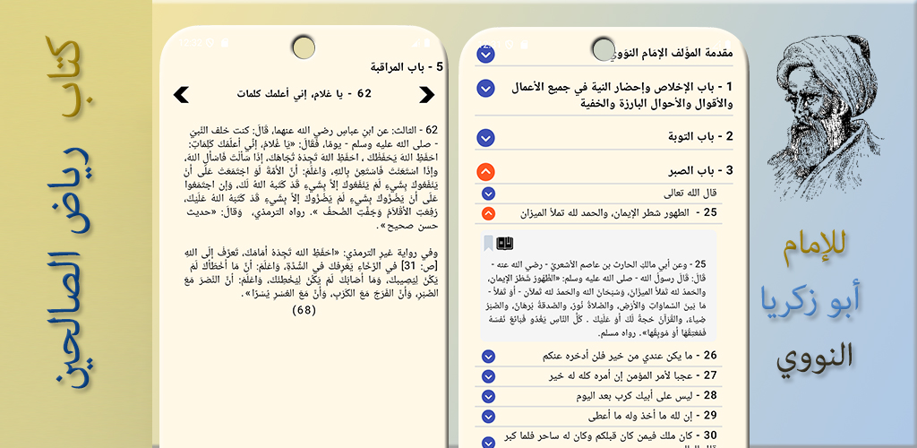 يقدّم لك تطبيق رياض الصالحين تجربة فريدة لقراءة واحد من أنقى كتب الحديث والأخلاق الإسلامية، من تأليف الإمام النووي – ذلك العالم الجليل، الفقيه الشافعي، والمحدّث اللغوي الكبير – الذي جمع في هذا الكتاب أصفى ما ورد عن رسول الله ﷺ من الأحاديث التي تزكي القلوب وتهذب السلوك وتقود المؤمن إلى رضوان الله تعالى.